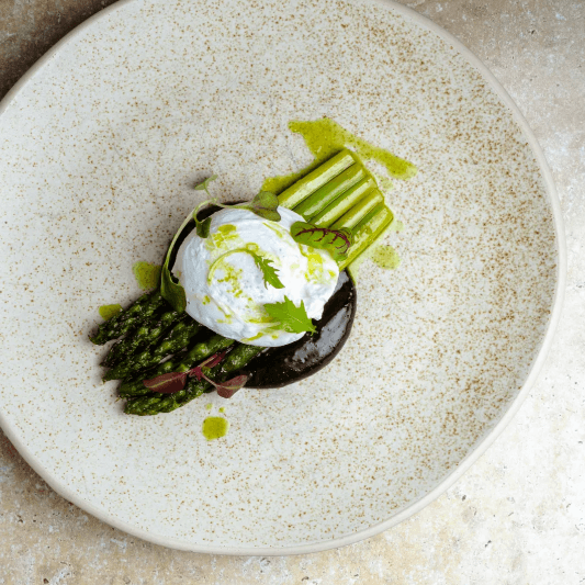 - 재료: 데친 아스파라거스, 삶은 달걀, 토마토, 발사믹 소스