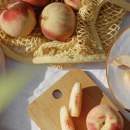 복숭아는 비타민 C, 베타카로틴, 폴리페놀이 풍부해 피부 노화 예방에 탁월합니다. 항산화 작용을 통해 피부 세포를 보호하고, 자외선으로부터 생기는 피부 손상을 줄여줍니다. 또한 복숭아의 추출물은 멜라닌 생성을 억제하여 기미, 잡티 예방 및 미백 효과를 제공합니다.
